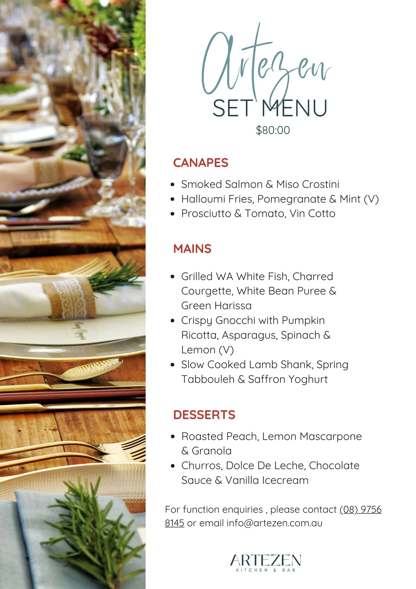 Our fully licensed venue combines elegance with a warm, inviting atmosphere, making it the ideal choice for hosting up to 100 guests for sit-down meals or canapé style receptions. With our spacious dining area and dedication to personalized service, Artezen transforms your vision into a seamlessly executed event.